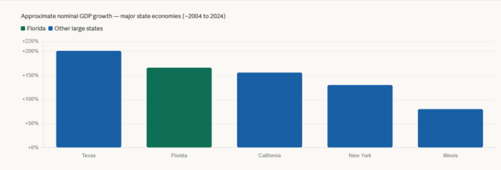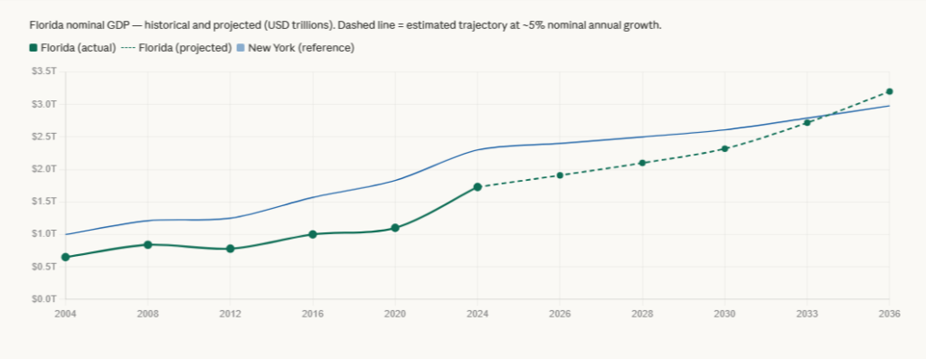 In the early 2000s, Florida’s nominal GSP was approximately $650 billion — fifth in the nation. By 2024, FRED data from the U.S. Bureau of Economic Analysis places Florida’s nominal GSP at $1,726,709.9 million — roughly 166% nominal growth in twenty years. That is not a regional growth story. That is a global one.