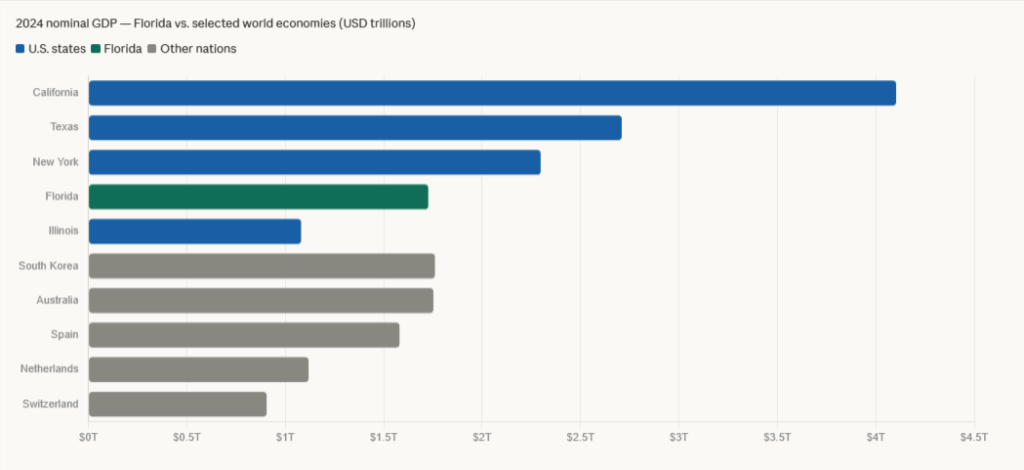 Florida’s economy is the fourth-largest in the United States, with a $1.726 trillion gross state product as of 2024. If Florida were a sovereign nation, it would rank as the world’s 15th-largest economy by nominal GDP — ahead of Spain and behind South Korea.